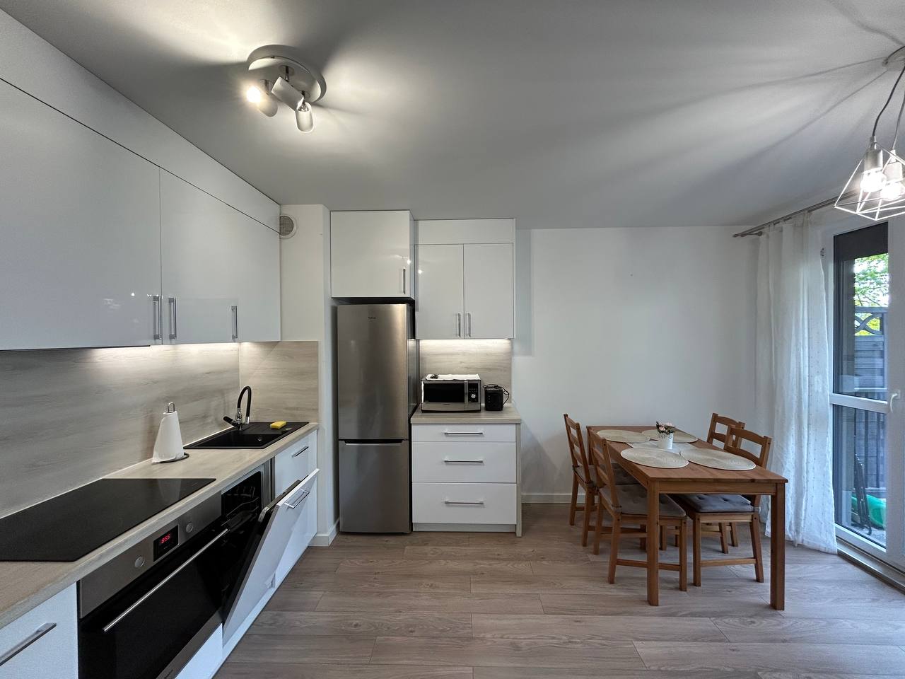 For rent: 2-room apartment in Słoneczny Zakątek residential complex, Krzyki district. It consists of a hallway, bathroom, living room with an open kitchen and access to a garden (high ground floor), and a bedroom. The kitchen is modern and fully equipped (dishwasher, fridge, induction hob, oven, microwave, kettle, toaster). There are large wardrobes in the hallway and bedroom. The bathroom features a spacious bathtub with a shower screen, a washing machine, and a sink with a cabinet. The windows have external blinds.