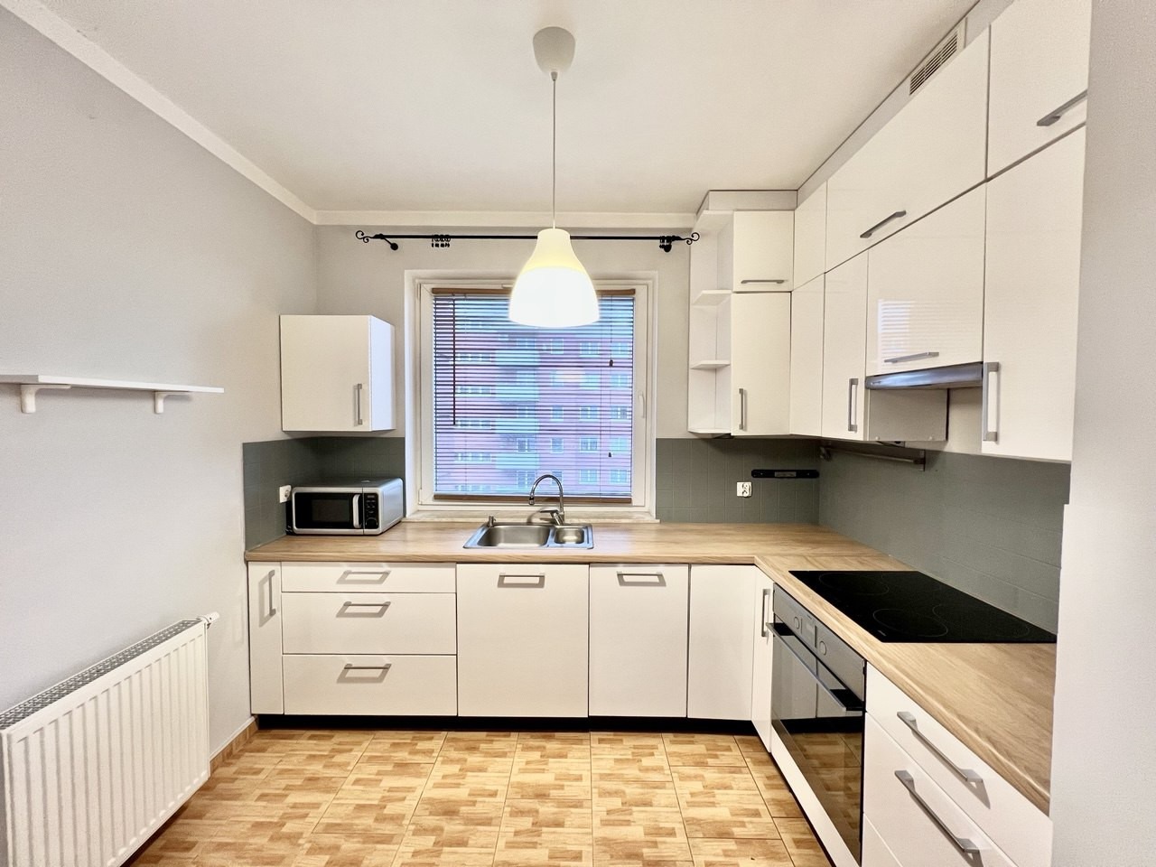 - Kuchnia: Stylowa kuchnia z białymi frontami i przestrzenią do przechowywania. Wyposażona w niezbędne sprzęty, takie jak piekarnik, płyta indukcyjna i mikrofalówka, co ułatwia codzienne gotowanie.