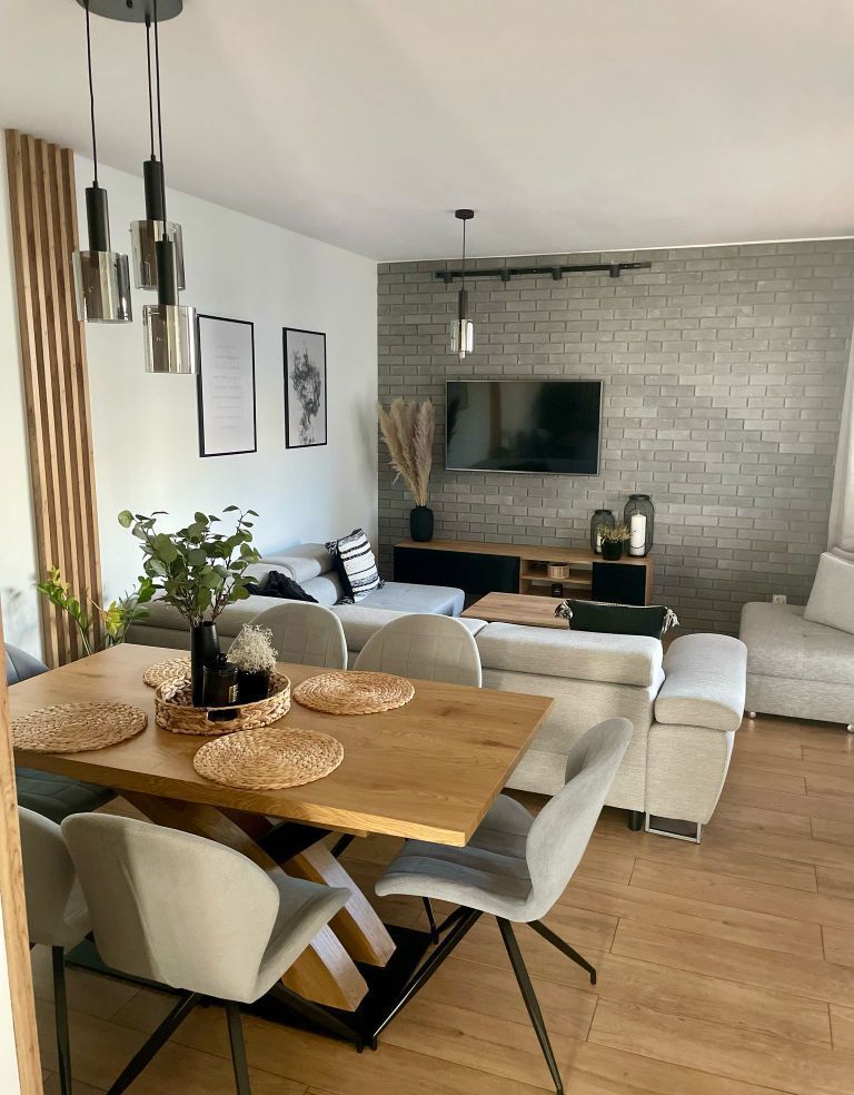 Стильная гостиная — большой угловой диван, обеденный стол, тумба под телевизор.